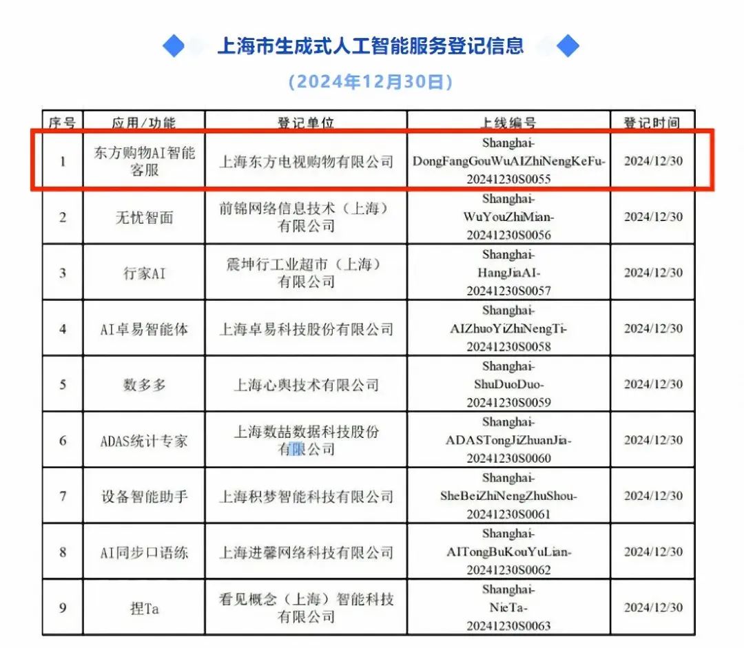 “东方购物AI智能客服”近日顺利完成上海市生成式人工智能服务登记备案。按照上海市网信办《生成式人工智能服务管理暂行办法》的要求,将在东方购物自有移动客户端APP的显著位置和使用AIGC的产品详情页面标明所取得的上线编号。