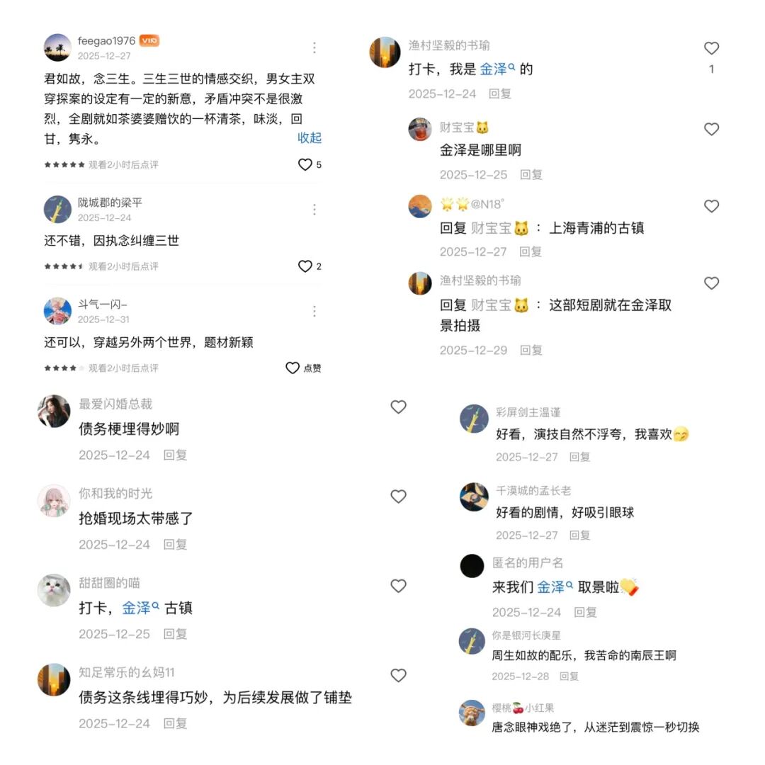 该剧于2025年12月24日起在红果、抖音平台同步上线,收获无数好评。观众们在为三世情缘动容的同时,也纷纷追问剧中的绝美取景地——答案,就是金泽古镇。
