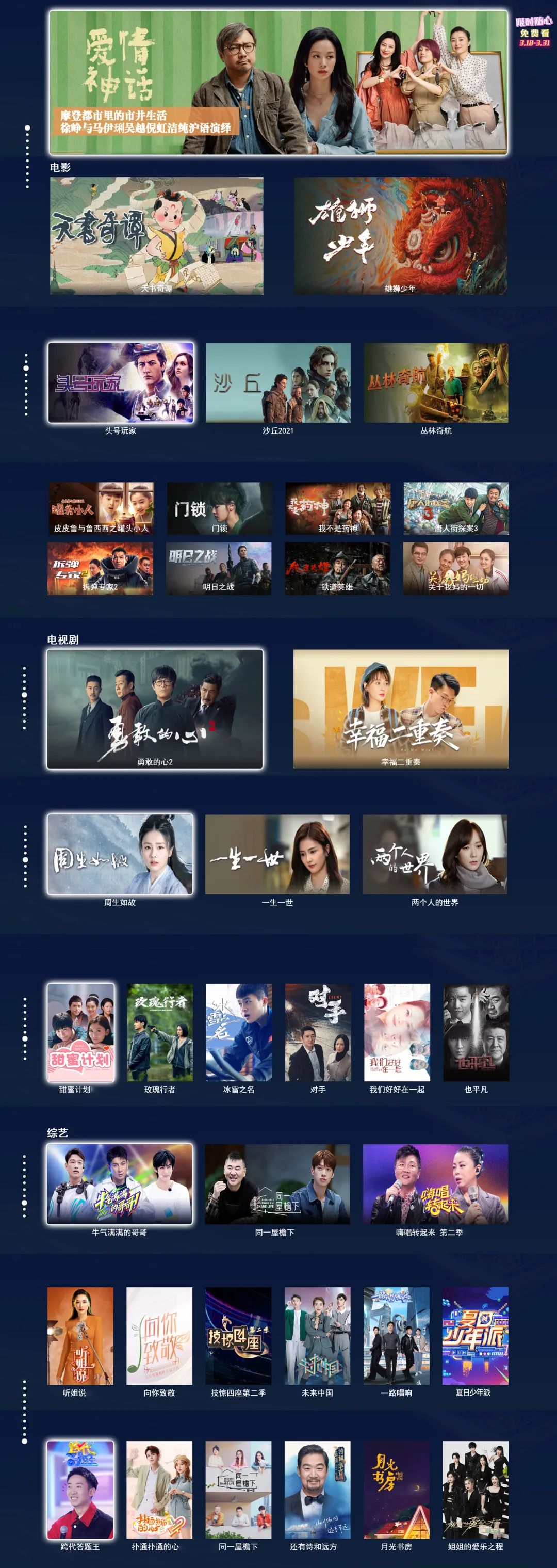 在当前上海疫情形势仍旧严峻复杂的情况下,全市人民众志成城,非必要不离“户”,默默地付出自己的努力,为了让申城人民“宅”家不寂寞,东方明珠新媒体旗下百视通联合上海电信、上海移动、上海联通三大运营商,即日起至3月31日,在IPTV平台推出 “限时免费随心看”专区,包括《爱情神话》、《雄狮少年》、《唐人街探案3》、《天书奇谭》、《两个人的世界》、《也平凡》、《一路唱响》等覆盖电影、电视剧、综艺等各类型的优质节目都将悉数奉上;同时,包括都市剧场HD、极速汽车HD、全纪实HD等在内的12个付费频道也将同步开启限时免费福利。