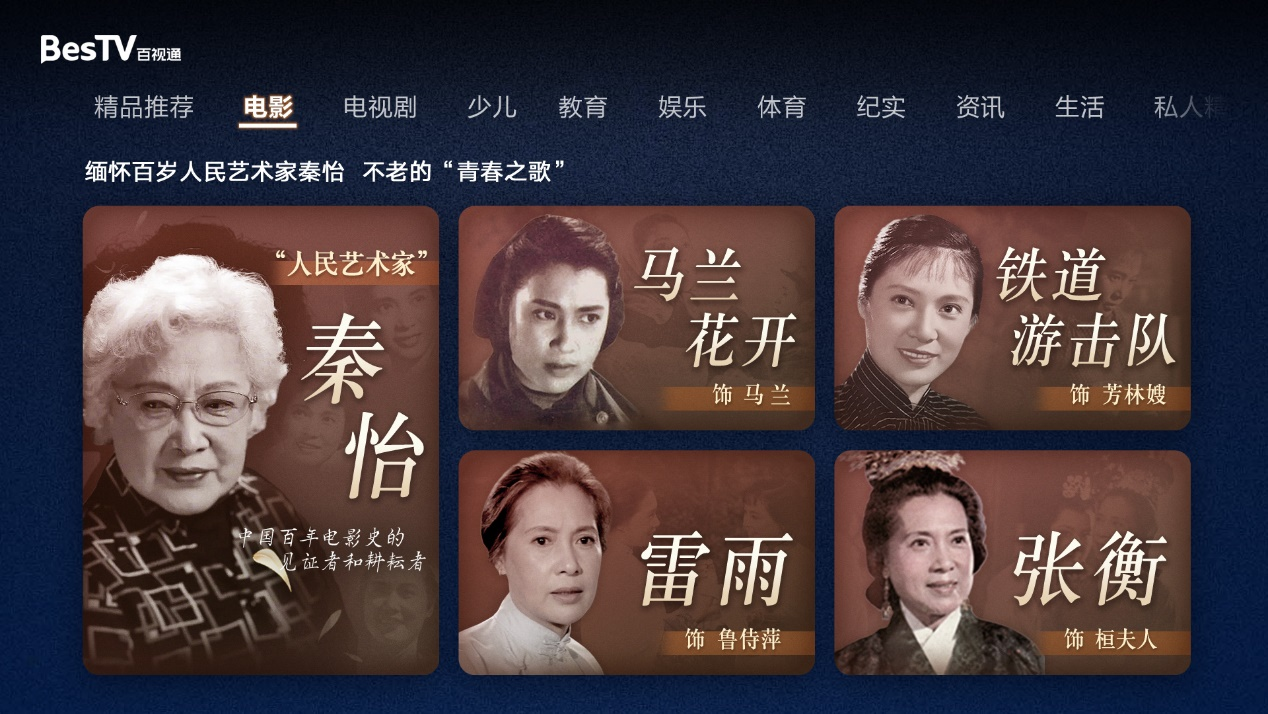 5月9日晨4时08分,中国百年电影史的见证者和耕耘者、“人民艺术家”秦怡在华东医院病逝,享年一百岁。她的光影人生路,见证了中国电影百年发展。为了纪念这位“最美奋斗者”,东方明珠新媒体旗下百视通IPTV、互联网电视和百视TV等大小屏播出平台纷纷推出纪念专题,整理汇集了秦怡女士的电影代表作品及生前采访片段,并在首页首屏进行推荐,致敬她美丽非凡的艺术人生。