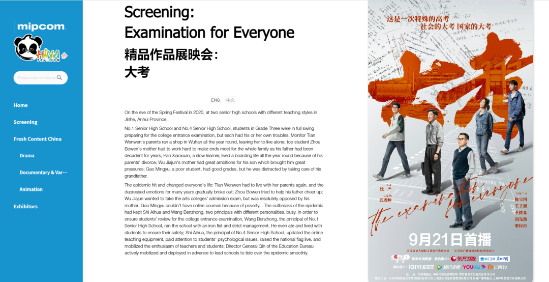 10月17日,重点剧目《大考》的专场展映会在中国联合展台在线平台正式上线,参加戛纳秋季电视节MIPCOM的与会人员,可以通过组委会官方线上展会OneMIP平台和中国联合展台在线平台的联动,欣赏到该剧的精彩宣传片和第一集完整视频。