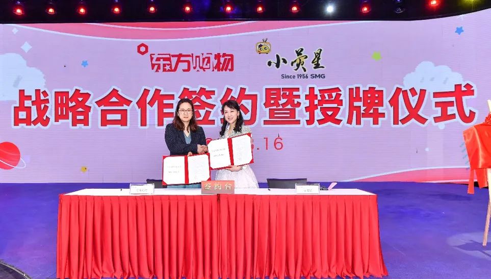 东方购物党委书记、总裁李卉蓉与上海小荧星集团党委副书记、总经理沈莹共同签署双方战略合作协议